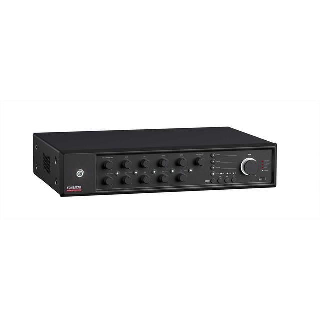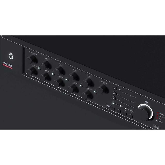 The Fonestar MAX-480Z is a powerful and versatile 480W RMS multi-zone PA amplifier designed for professional installations requiring flexible audio distribution across multiple areas. With Class-D amplification, integrated media playback and advanced control features, it is ideal for commercial, retail and public address systems.