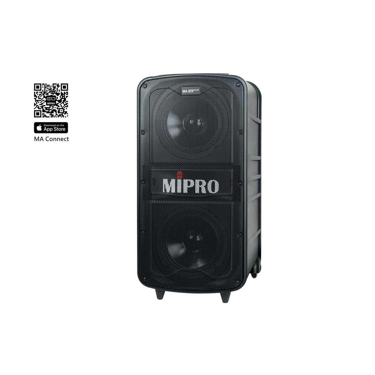 The MiPro MA-929 PLUS is a flagship portable PA system designed for powerful, professional-grade sound reinforcement in demanding indoor and outdoor environments. Delivering up to 505W peak output, this complete all-in-one solution includes two built-in 5.8GHz licence-free (UK) wireless microphone receivers (microphones not included), as well as Bluetooth streaming, USB / SD media playback, microphone and line inputs, and a high-capacity lithium-ion battery system for true portable performance. Supplied with a waterproof cover for added protection, the MA-929 PLUS is ideal for schools, events, sports days, presentations, fitness sessions, conferences, and live performance use where clarity, coverage, and reliability are essential.