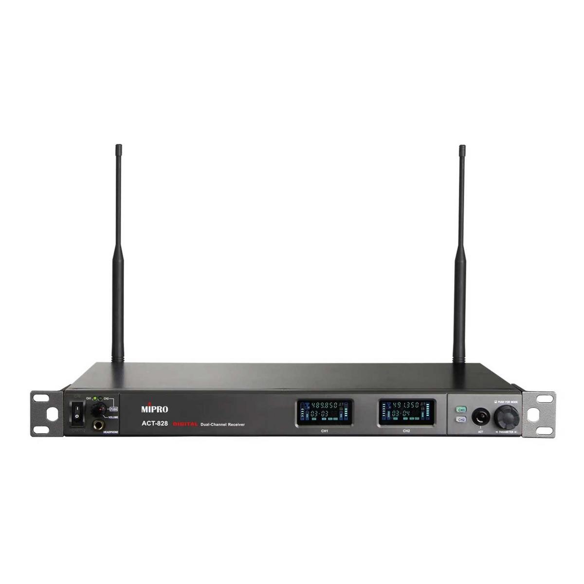 A: The ACT-828 is compatible with MIPRO ACT-800 series handheld and bodypack transmitters, and also supports TA-80 digital adapters and BC-100DT gooseneck microphone bases.