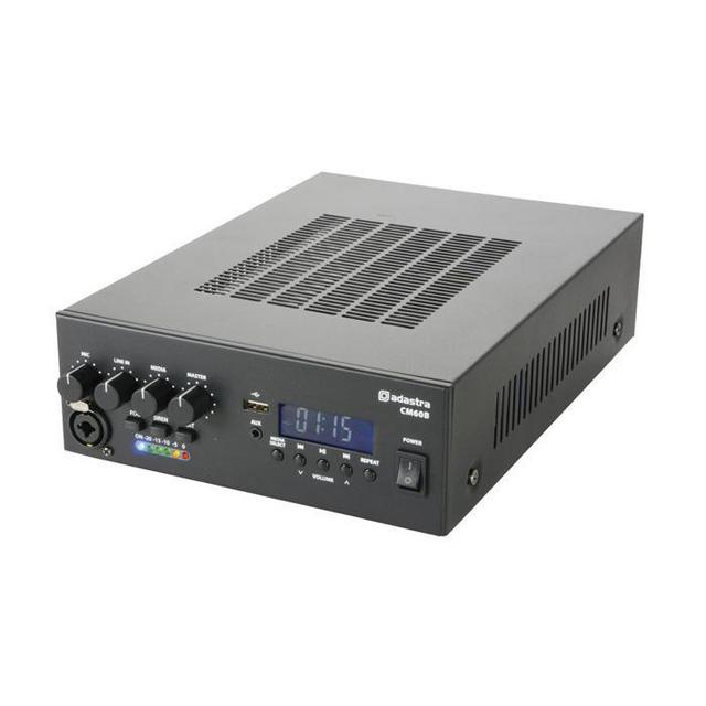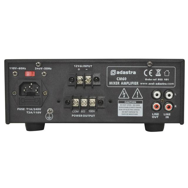 The CM60 Compact PA Amplifier boasts a 60W output either at 100V Line or Low Impedance at 8 Ohms. It has a Combo Jack Microphone input and a Line Level Input and Output to go to additional Slave amplifiers or even a recording device. In addition the CM60 also has a Built in MP3 Player which takes SD Cards or FAT32 Formatted USB Drives, FM Tuner and Bluetooth Receiver